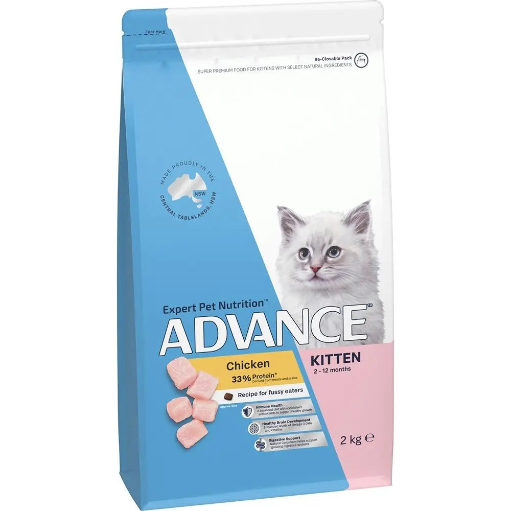 Advance Kitten Dry Cat Food. Give your growing friend the best start in life with a diet that's tailored to their needs. Nutrient-rich, gluten-free and artificial-free wholegrains keep them happy and healthy, while quality minerals, fibres and proteins support healthy bone and joint development.