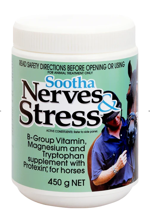 SOOTHA NERVES & STRESS™ as a high dose B-vitamin, magnesium and tryptophan supplement with PROTEXIN® formulated for highly strung horses susceptible to the stress of transport, competition and heavy training or when they become hyperactive on high-grain, low roughage diets or when they are confined to stables without adequate exercise throughout the day. A deficiency of B-group vitamins, magnesium and tryptophan has been linked to nervous symptoms and dietary supplementation has been reported to be effective as a mood stabiliser. Nervous stress plays havoc with the horse’s digestive system, disrupting the normal healthy balance of gut microflora and allowing pathogens to flourish. Visible symptoms include reduced appetite, temperament changes and soft droppings. SOOTHA NERVES & STRESS™ contains PROTEXIN® which restores the gut microflora balance, helps to improve digestive efficiency and reduces the effects of stress.