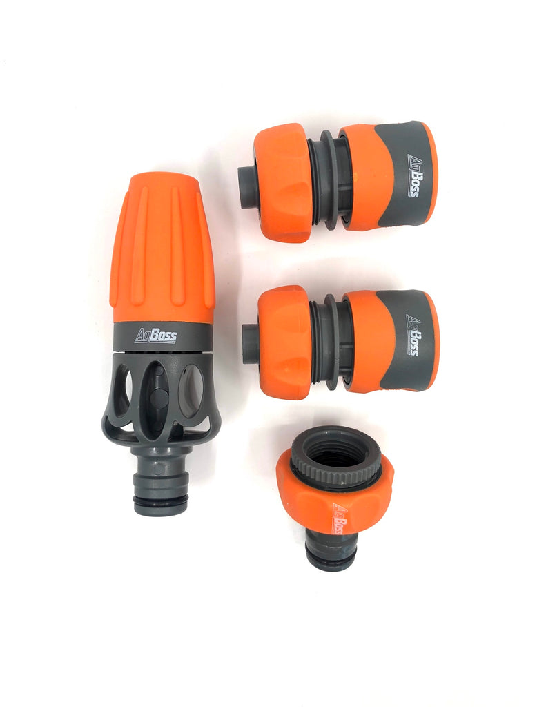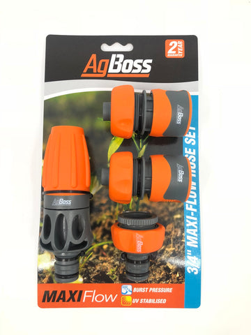 AgBoss 18mm Maxi-Flow Hose Set is the perfect addition to your 18mm or 3/4" AgBoss Hose. It includes: 2 x 18mm Maxi-Flow Connector 1 x 18-25mm Maxi-Flow Tap Adaptor 1 x 18mm Maxi-Flow Nozzle